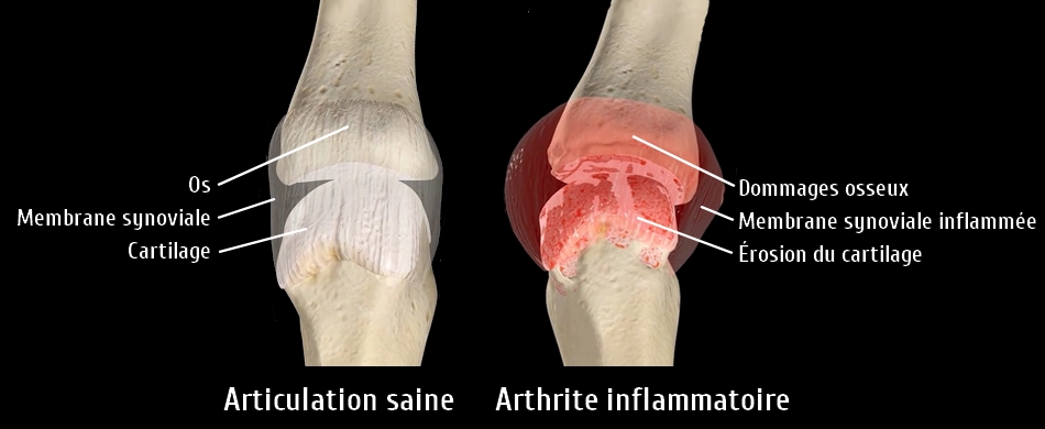 La cause de l’arthrite rhumatoïde est inconnue, mais on connaît son impact sur le corps. Il s’agit d’une maladie auto-immune, c’est-à-dire une condition qui mène le système immunitaire à s’attaquer aux cellules saines du corps. Dans le cas de l’arthrite rhumatoïde, le système immunitaire s’en prend à la membrane synoviale des articulations, ce qui génère de l’inflammation et cause de la douleur et de l’enflure articulaire. À long terme, si l’inflammation n’est pas contrôlée, de l’érosion du cartilage et des dommages osseux peuvent survenir. (1, 2, 3)