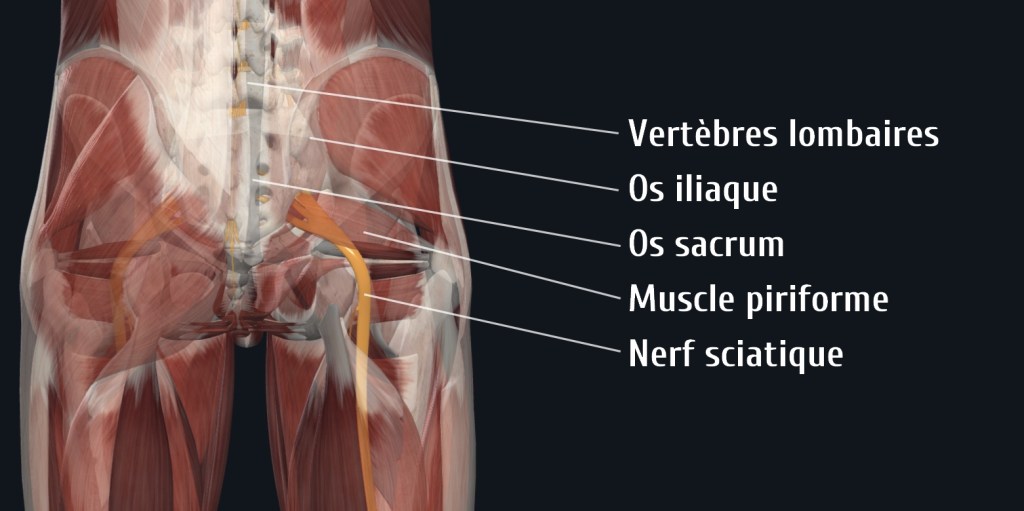 Le nerf sciatique est formé à partir des racines nerveuses émergeant entre les vertèbres de la colonne lombaire et du sacrum (au bas du dos). De chaque côté, au centre de la fesse, ces racines se regroupent en un large nerf et forment le nerf sciatique qui se prolonge derrière la cuisse, la jambe et sous le pied. Ce nerf contrôle une partie des sensations et des mouvements de la jambe. (1, 2, 3)